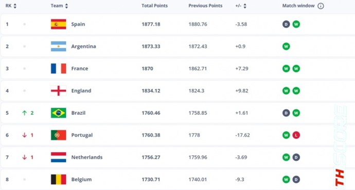ในการจัดอันดับครั้งก่อน สเปน อาร์เจนตินา และฝรั่งเศสอยู่ในสามอันดับแรก