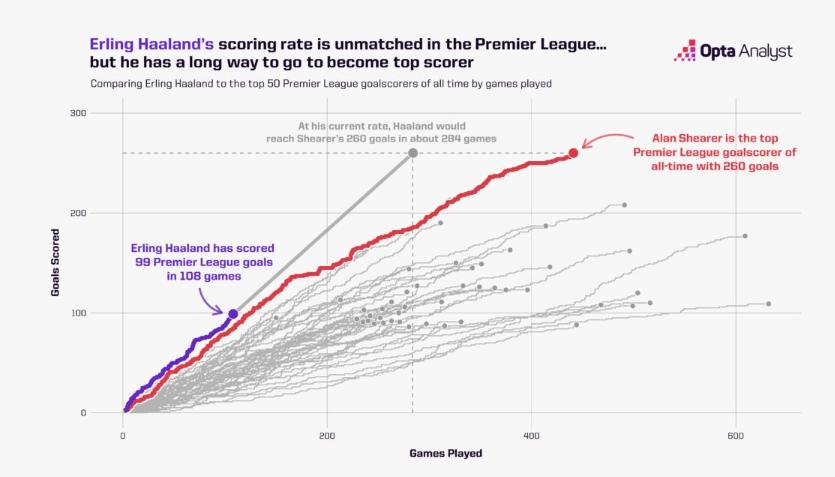 ประตูถัดไปในพรีเมียร์ลีกจะทำให้เขาถึง 100 ประตูในลีกสูงสุดอังกฤษ โดยใช้เวลาเพียง 108 นัด เจ้าของสถิติปัจจุบันคืออลัน เชียเรอร์ ที่ใช้เวลา 124 นัดในการถึง 100 ประตู... ดังนั้นถ้าฮาแลนด์ทำลายสถิติที่สนามเดิมของเชียเรอร์ที่เซนต์เจมส์พาร์คในวันเสาร์นี้ มันจะสมเหตุสมผลมาก ในขณะที่ทีมของเป๊ป กวาร์ดิโอล่าเตรียมไปเยือนนิวคาสเซิล ยูไนเต็ด
