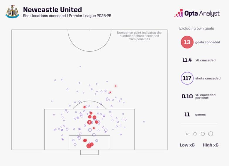 แต่ถ้ามีทีมที่ตั้งรับหยุดเบอร์เก้าอันตรายของซิตี้ได้ นิวคาสเซิลก็มีโอกาส... เฉพาะซิตี้ (10.4) และอาร์เซนอล (6.1) เท่านั้นที่มีค่า xGA (ค่าคาดการณ์ประตูเสีย) ต่ำกว่านิวคาสเซิล (11.4) ในฤดูกาลนี้ ทีมของเอ็ดดี้ ฮาวยังเก็บคลีนชีต 5 นัด รั้งอันดับสองร่วม รองจากอาร์เซนอลที่ 7 นัด