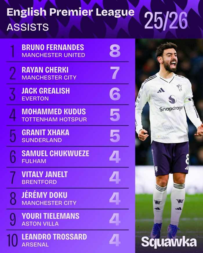 10 มกราคม – Squawka สื่อเก็บสถิติฟุตบอลชื่อดังได้เปิดเผยข้อมูลการทำแอสซิสต์ในศึกพรีเมียร์ลีกอังกฤษฤดูกาลนี้ ผลปรากฏว่า บรูโน่ แฟร์นันด์ส กองกลางจากแมนเชสเตอร์ ยูไนเต็ด รั้งอันดับ 1