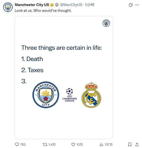 ทางสโมสรได้โพสต์ข้อความว่า "ดูพวกเราสิ... ใครจะไปคิดล่ะ" พร้อมแนบรูปภาพล้อเลียน (Meme) ที่ดัดแปลงจากสุภาษิตตะวันตกชื่อดังที่ว่า "ในโลกนี้ไม่มีอะไรแน่นอน นอกจากความตายและภาษี" โดยเรือใบสีฟ้าได้เพิ่มข้อที่สามเข้าไปคือ "แมนฯ ซิตี้ ดวล เรอัล มาดริด ในศึก UCL"
