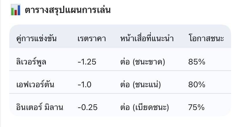 • ถ้าเน้นชัวร์กว่าเดิม: ลองสลับ อินเตอร์ มิลาน เป็นเล่น "สกอร์ต่ำ 2.5" แทน เพราะนัดแรกของบอลถ้วยมักจะยิงกันน้อยครับ