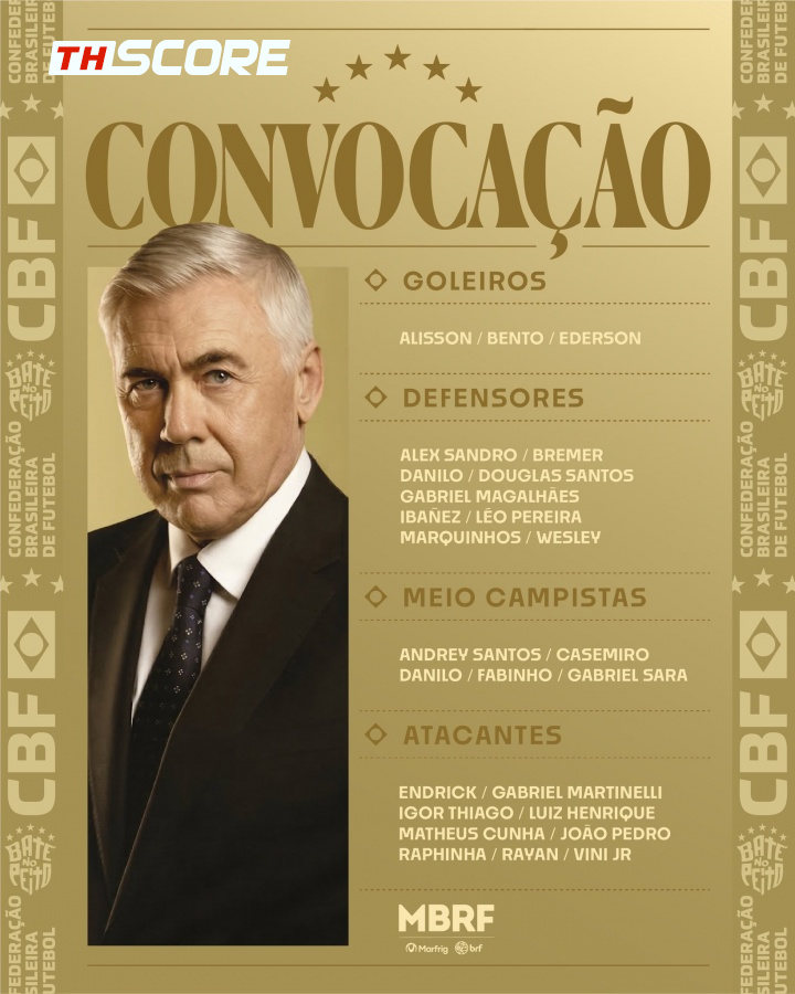 ในขณะที่แกนหลักรายอื่นอย่าง วินิซิอุส จูเนียร์, ราฟินญ่า, คาเซมิโร่ และดาวรุ่งพุ่งแรงอย่าง เอ็นดริค ยังคงมีชื่อติดทีมตามคาด อย่างไรก็ตาม ทัพแซมบ้าต้องเผชิญกับปัญหานักเตะบาดเจ็บหลายราย ทั้ง โรดรีโก้, เอแดร์ มิลิเตา, บรูโน่ กิมาไรส์ และ เอสเตเวา ซึ่งล้วนไม่มีชื่อในชุดนี้