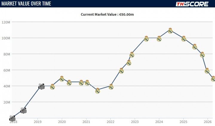 แข้งชาวบราซิลวัย 25 ปีรายนี้ เคยมีมูลค่าพุ่งสูงถึง 110 ล้านยูโร เมื่อเดือนมิถุนายน 2024 แต่หลังจากนั้นเป็นต้นมา มูลค่าของเขากลับลดลงติดต่อกันถึง 5 ครั้ง โดยในฤดูกาลนี้เขาลงสนามให้ "โลส บลังโกส" ไปทั้งหมด 27 นัดในทุกรายการ แต่ทำประตูได้เพียง 3 ประตู ซึ่งถือเป็นสถิติที่น่าผิดหวัง