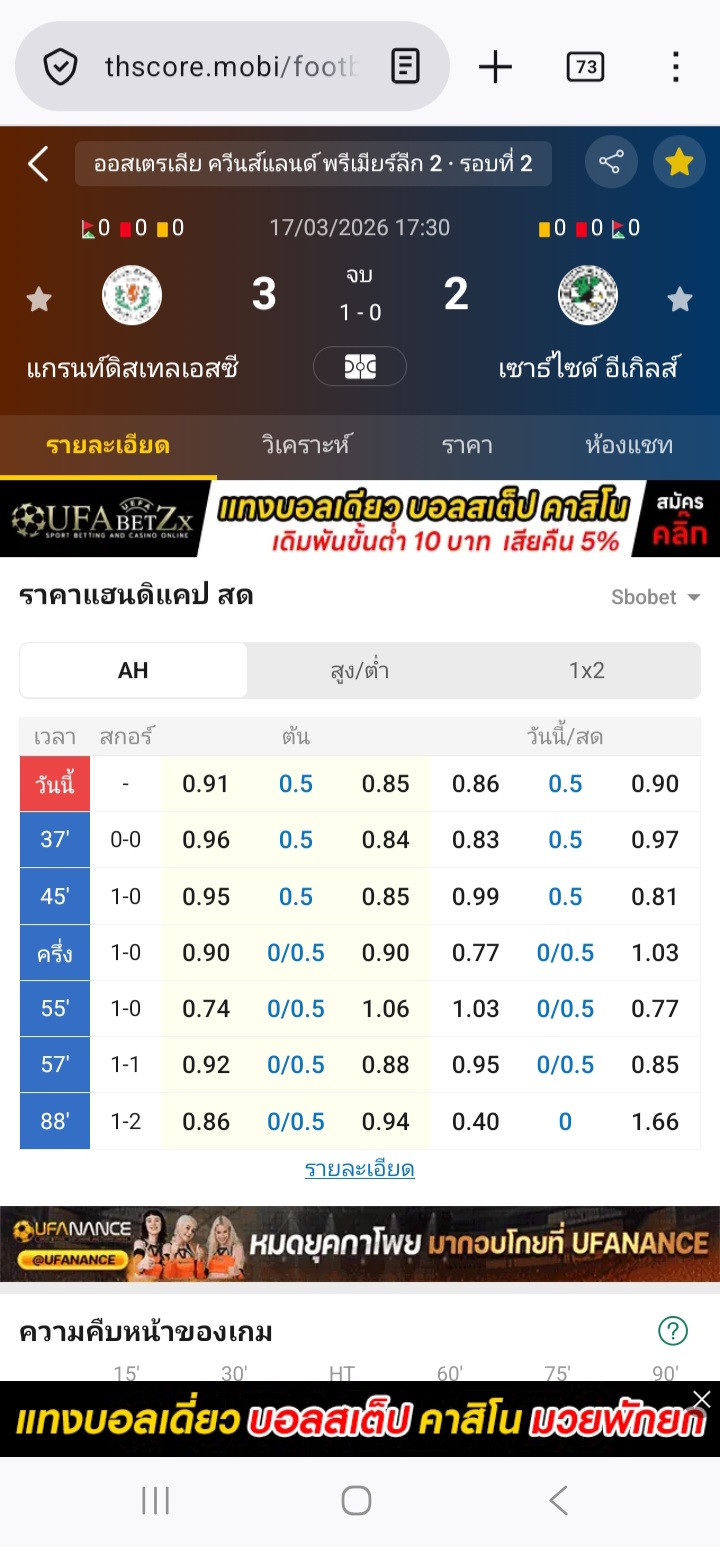 17 มี.ค. 2026,17:30 แกรนท์ดิสเทลเอสซี VS เซาธ์ไซด์ อีเกิลส์ ต่อเจ้าบ้าน 0.5⭕ได้เต็มจบ 3-2