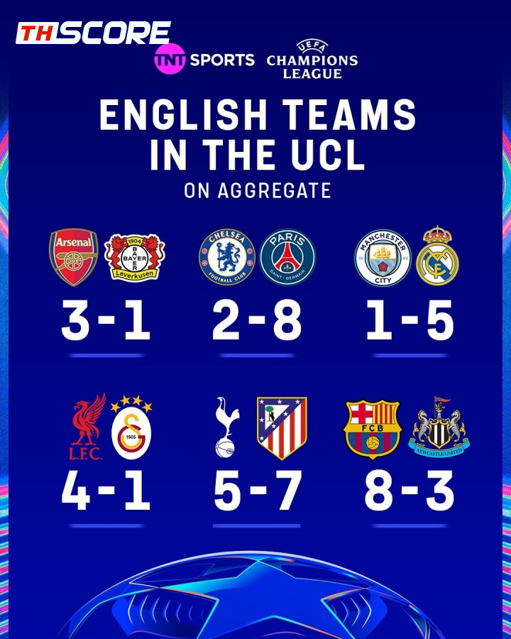 แม้ว่าในรอบลีกเฟส (League Stage) ทั้ง 6 สโมสรจากอังกฤษจะโชว์ฟอร์มแกร่งผ่านเข้ารอบมาได้ทั้งหมด แต่ในรอบน็อกเอาต์กลับต้องเจอกับ "ฝันร้าย" เริ่มจาก อาร์เซนอล ที่ยังคงรักษามาตรฐานความแข็งแกร่ง เอาชนะ เลเวอร์คูเซ่น ไปด้วยสกอร์รวม 3-1 ตีตั๋วเข้ารอบแปดทีมได้เป็นทีมแรกๆ ขณะที่ ลิเวอร์พูล โชว์ฟอร์มดุพลิกสถานการณ์กลับมาเอาชนะ กาลาตาซาราย ด้วยสกอร์รวม 4-1 คว้าตั๋วใบสุดท้ายเข้ารอบไปได้อย่างสวยงาม