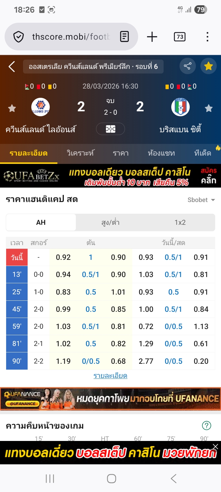28 มี.ค. 2026,16:30 ควีนส์แลนด์ ไลอ้อนส์ VS บริสแบน ซิตี้ รองทีมเยือน 1 ลูก⭕ได้เต็ม2-2