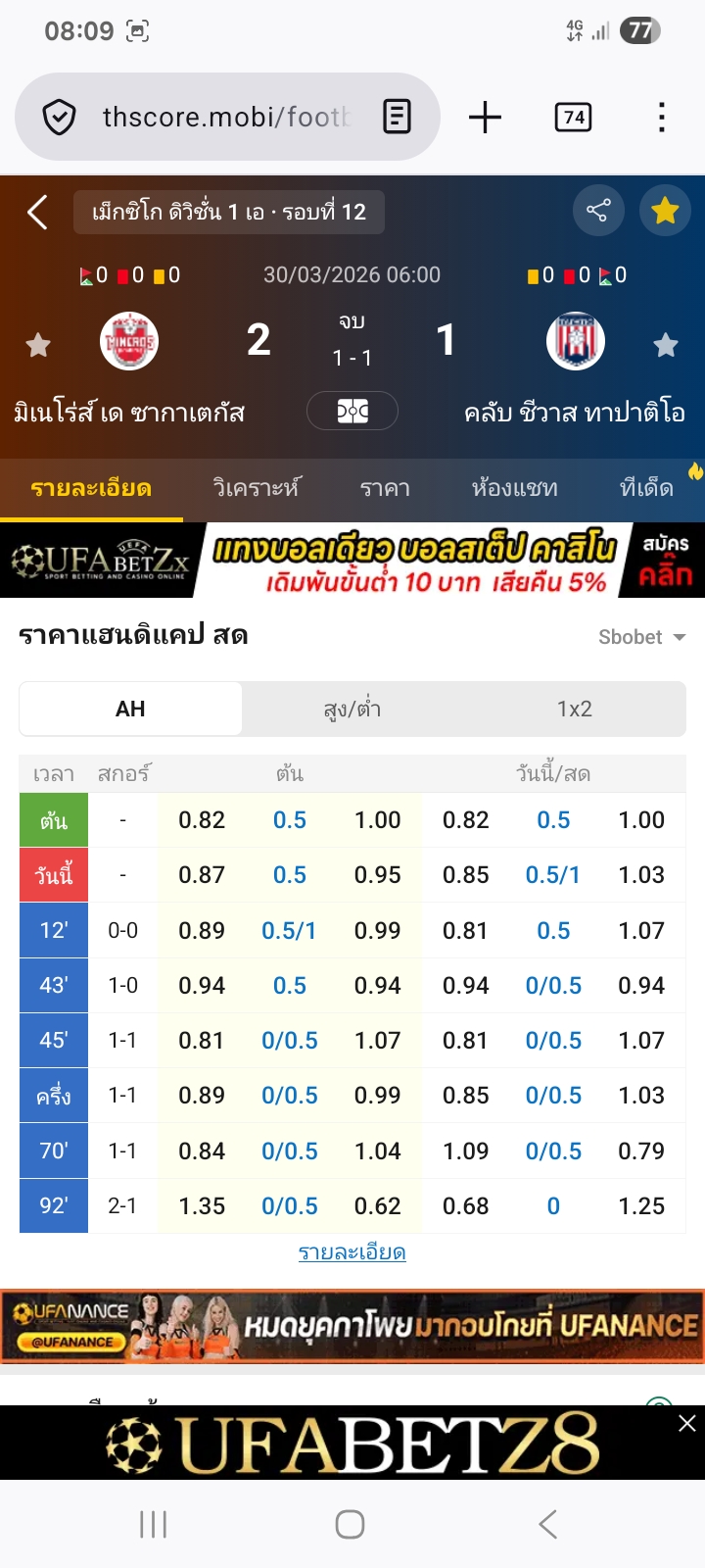 30 มี.ค. 2026,06:00 มิเนโร่ส์ เด ซากาเตกัส VS คลับ ชีวาส ทาปาติโอสูงกว่า 2.75⭕ได้ครึ่ง2-1