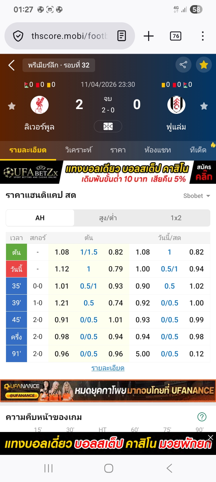 11 เม.ย. 2026,23:30 ลิเวอร์พูล VS ฟูแล่ม ต่ำกว่า 3.25⭕ได้เต็ม2-0
