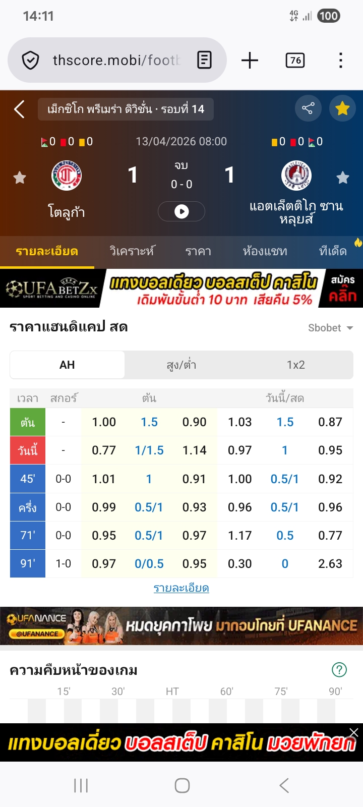 13 เม.ย. 2026,08:00 โตลูก้า VS แอตเล็ตติโก ซาน หลุยส์ รองทีมเยือน 1/1.5⭕ได้เต็ม1-1