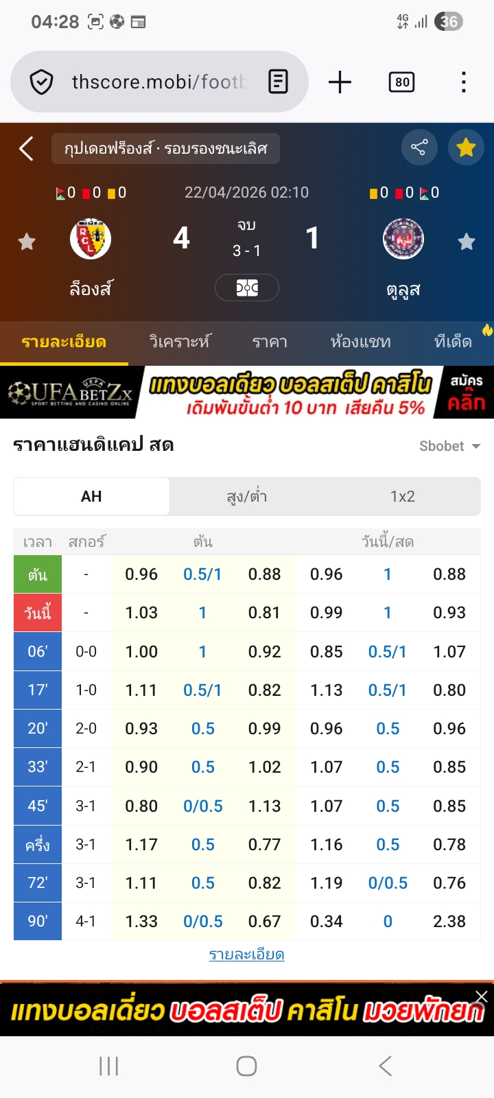 22 เม.ย. 2026,02:10 ล็องส์ VS ตูลูส ต่อเจ้าบ้าน 1 ลูก⭕เต็มตีนเตี่ย ( ดูรูป )