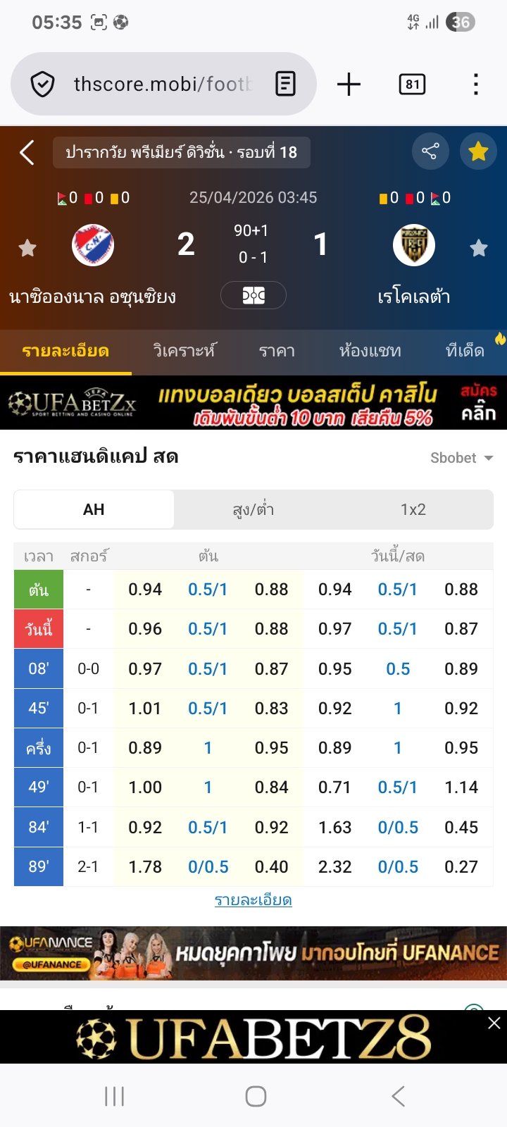 25 เม.ย. 2026,03:45 นาซิอองนาล อซุนซิยง VS เรโคเลต้า สูงกว่า 2.25⭕แดก (ดูรูป)